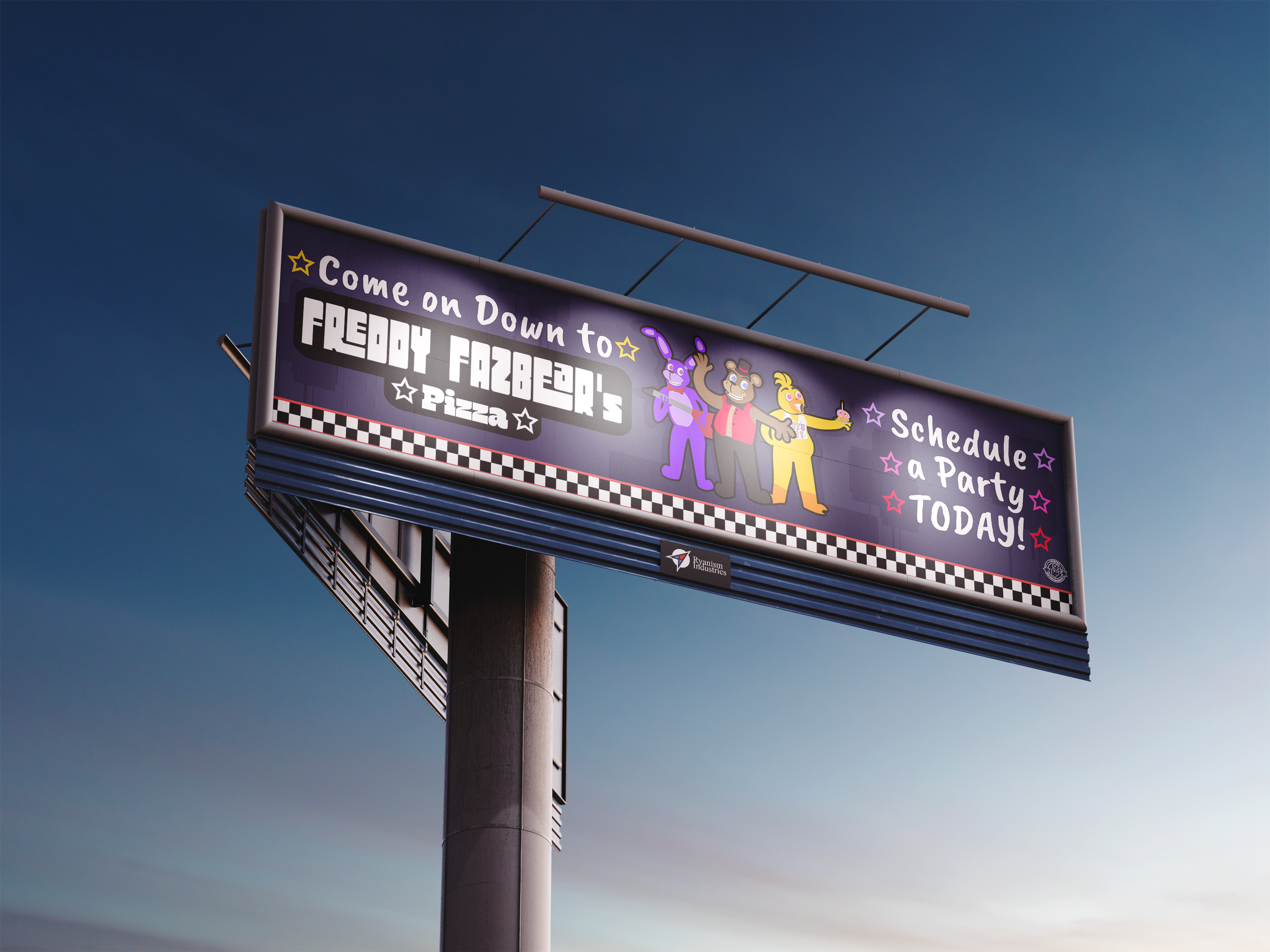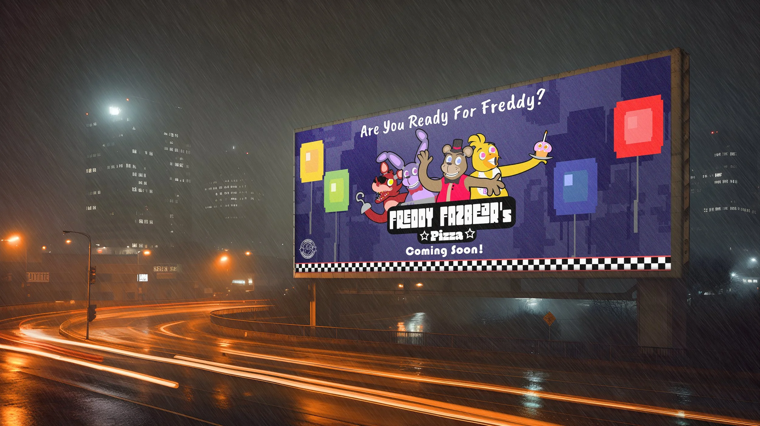 Billboards advertising Freddy Fazbear’s Pizza.